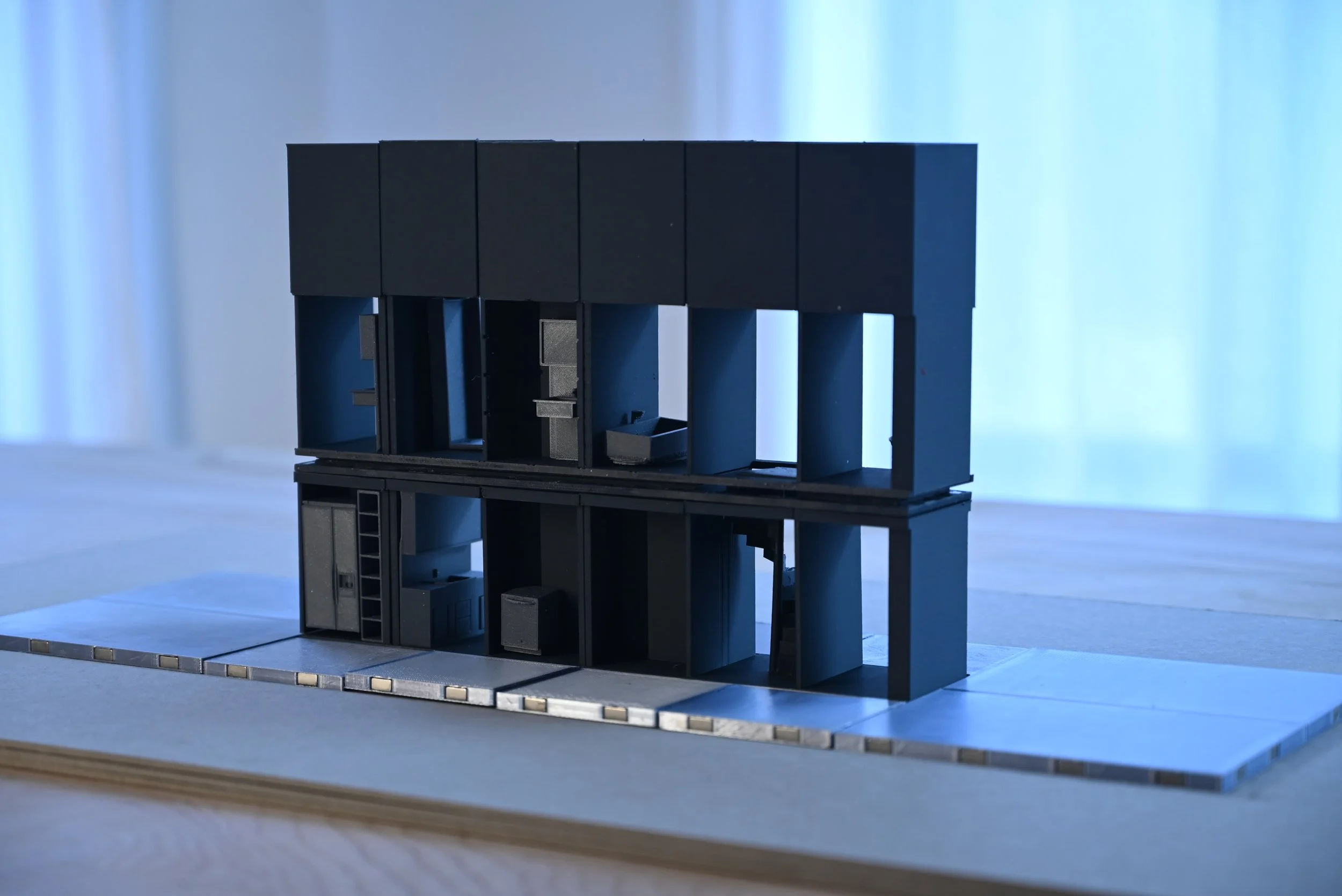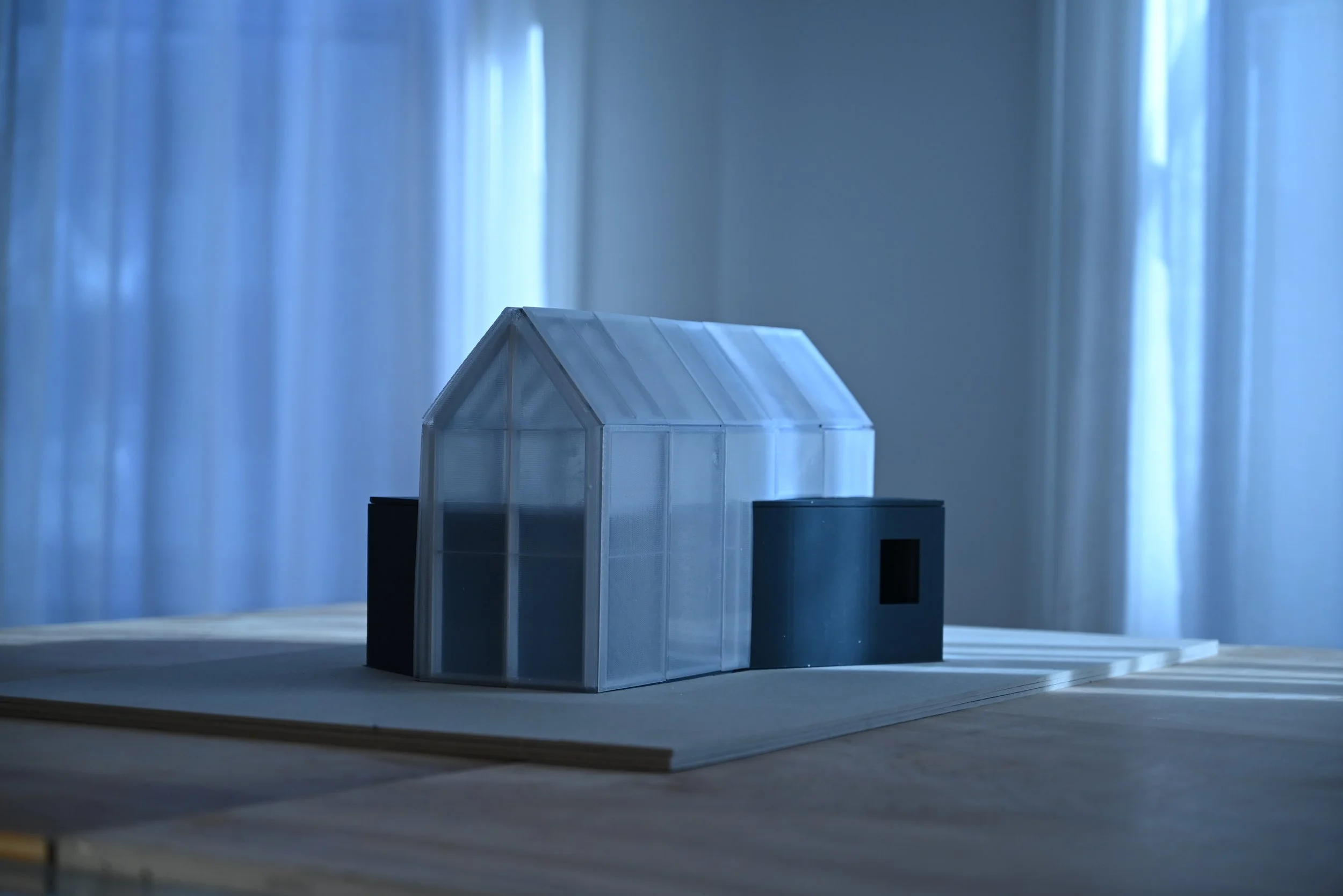 Whilst the core is fixed off site, the second skin, consisting of removable panels with varying opacity, are chosen on a case-by-case basis in accordance with the sun exposure/orientation of each specific site condition. As such, the generic character of mass production is overcome, providing a range of possibilities from one construction method and material pallet.